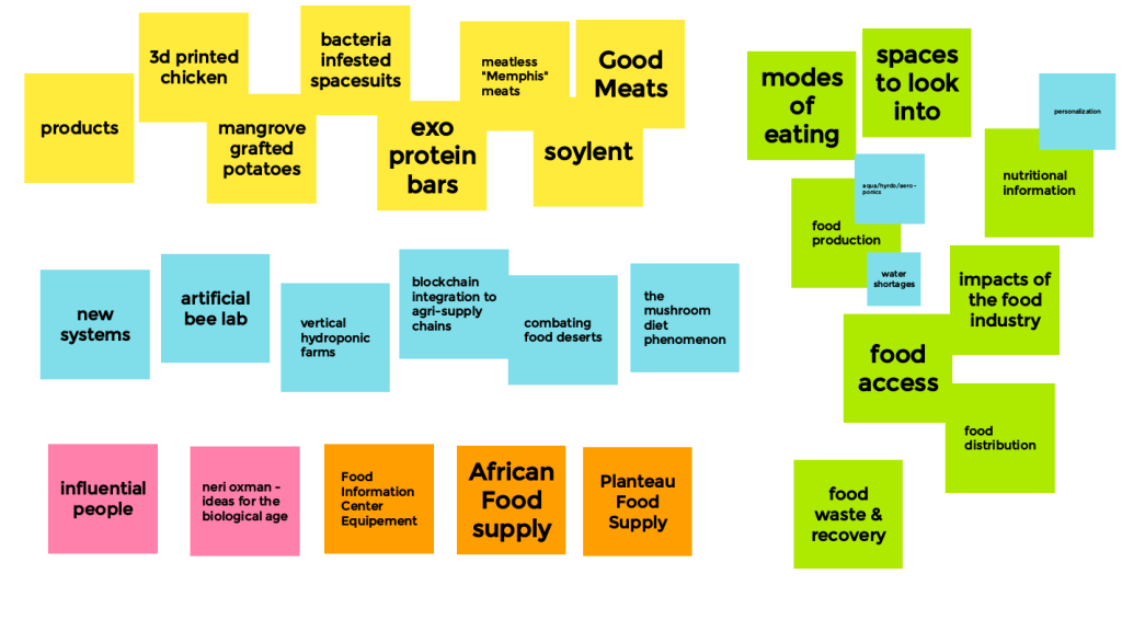To help narrow down our focus as the “food as infrastructure” group, we collectively brainstormed ideas for what food-related topics we were interested in. Being able to visualize our similar and different ideas helped us narrow our problem space to food waste and recovery.